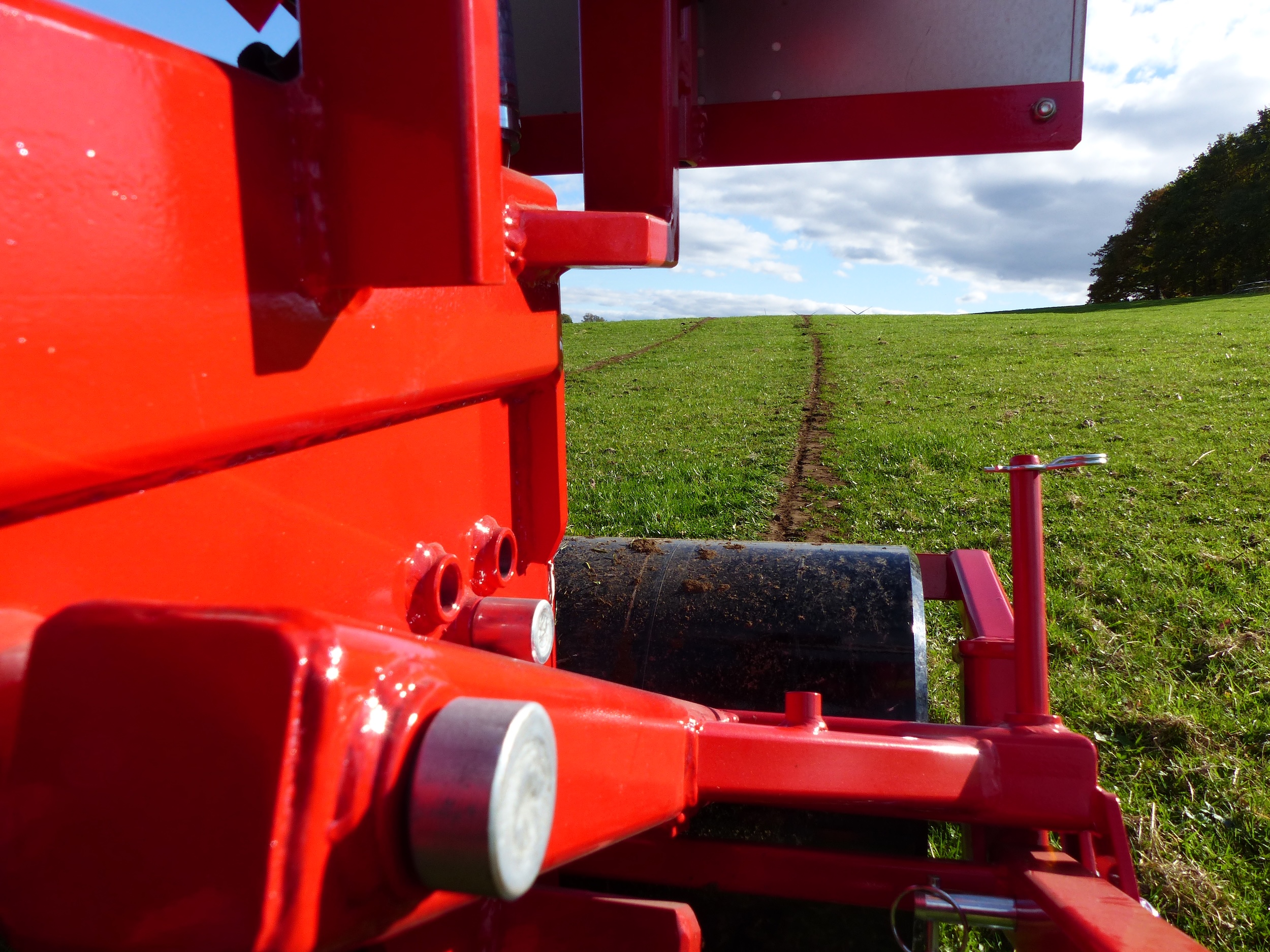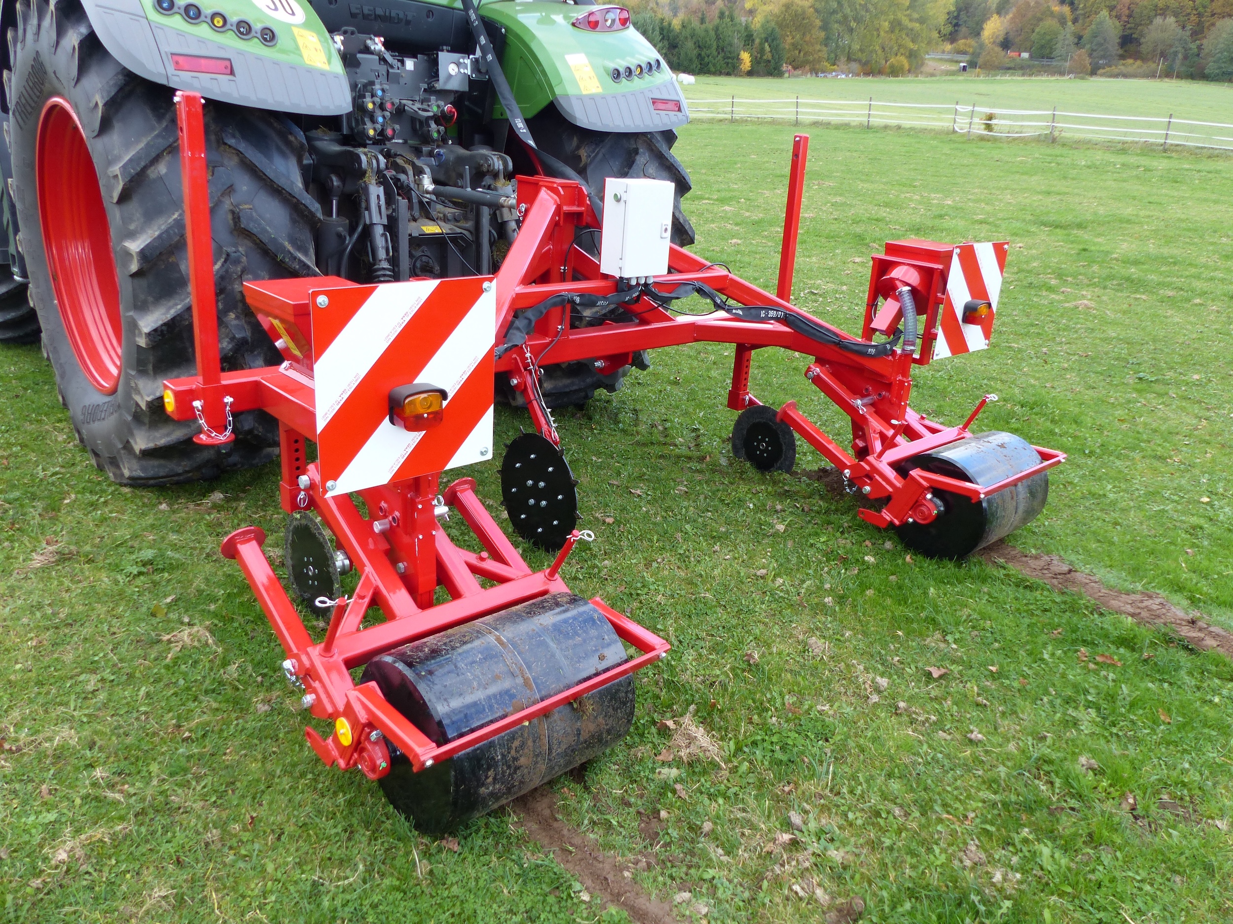 Durch das Absenken der Traktorhydraulik dringt das Pflugschar in den Boden ein, während die Sechscheibe die Vegetation durchtrennt und so eine schmale Pflugfurche erzeugt.